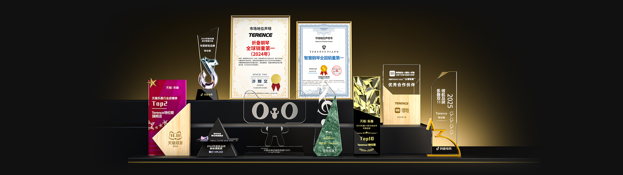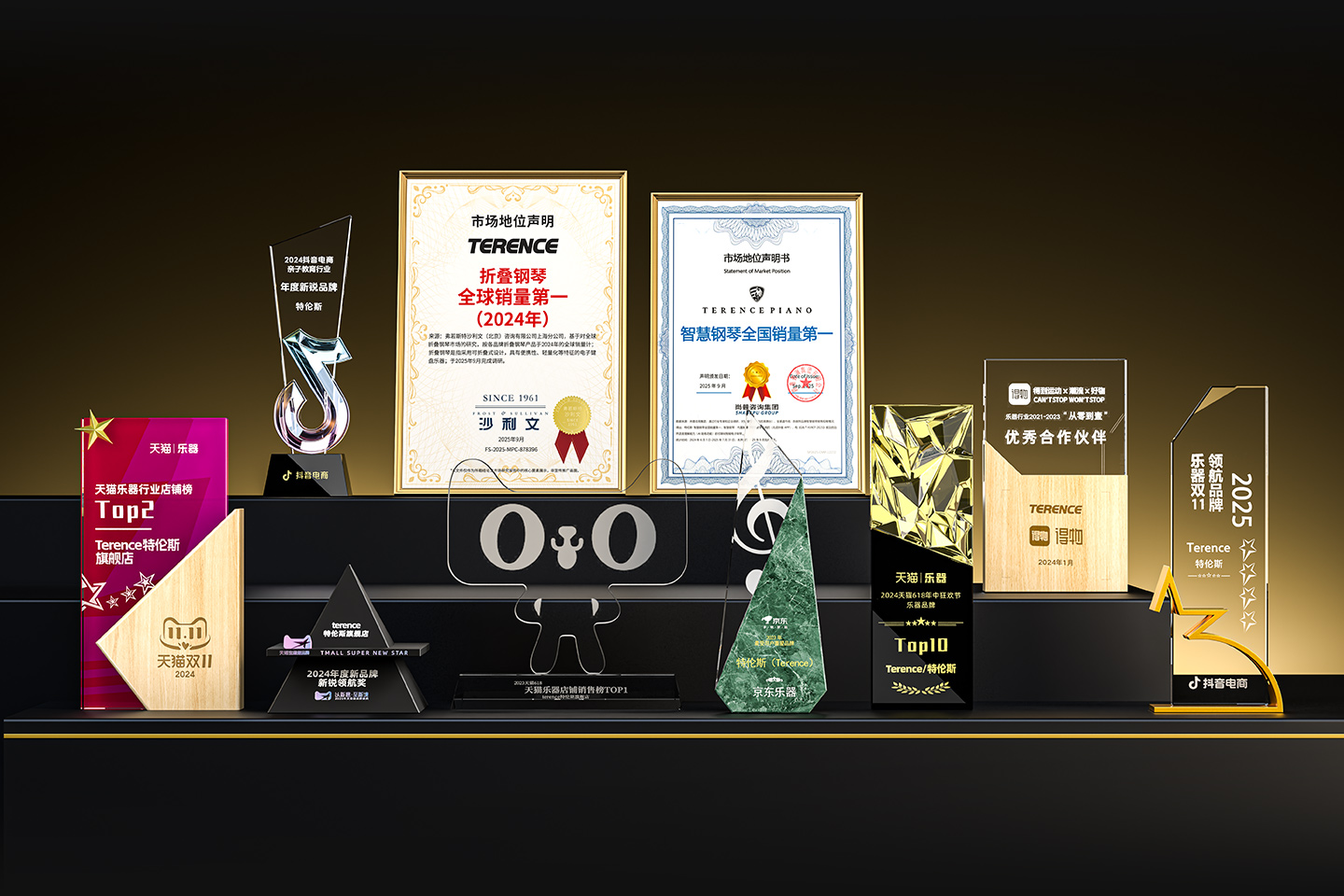 特倫斯創(chuàng)新科技榮獲:折疊鋼琴全球銷(xiāo)量第一(2024年)[1]、智慧鋼琴全國(guó)銷(xiāo)量第一[2]、2025年天貓618樂(lè)器設(shè)備店鋪榜TOP2、2025年天貓雙11樂(lè)器店鋪榜TOP1、2025年天貓雙11樂(lè)器品牌榜TOP3、2022年天貓樂(lè)器行業(yè)TOP1、2023年天貓618樂(lè)器行業(yè)TOP1、2024抖音電商年度新銳品牌、2024天貓樂(lè)器店鋪TOP2、2024天貓年度新品牌新銳領(lǐng)航獎(jiǎng)、2023年京東最受用戶(hù)喜愛(ài)品牌等獎(jiǎng)項(xiàng);